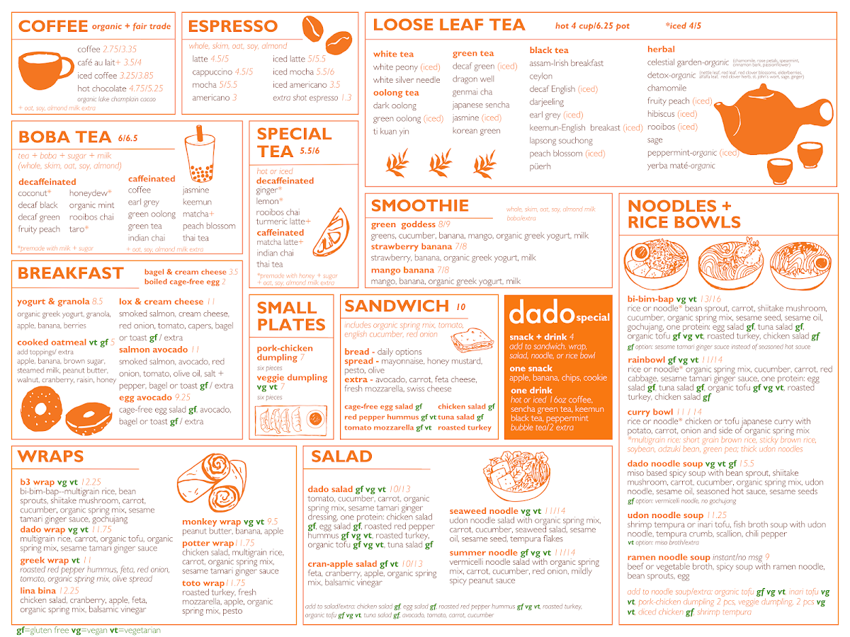 Welcome to Dado Tea, a charming café nestled in Cambridge, MA, at 955 Massachusetts Ave. Renowned for its inviting atmosphere, Dado Tea offers a delightful menu that caters to various tastes and preferences.
